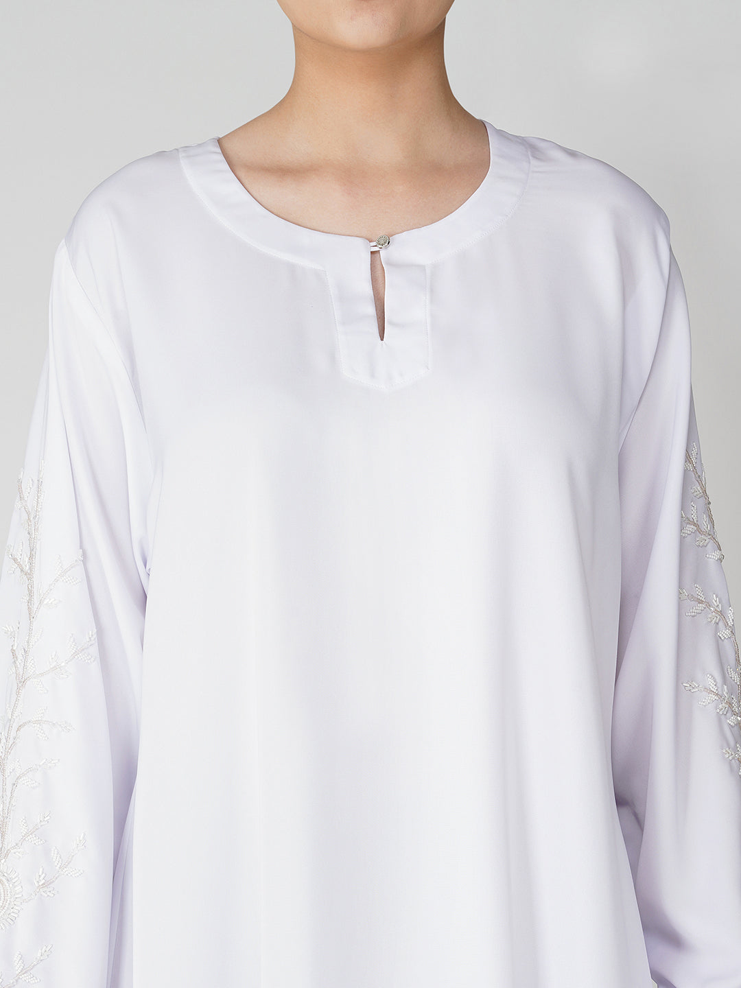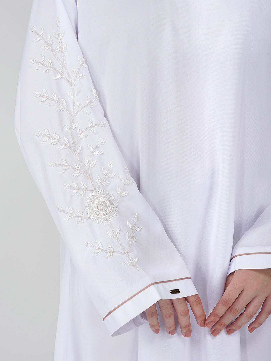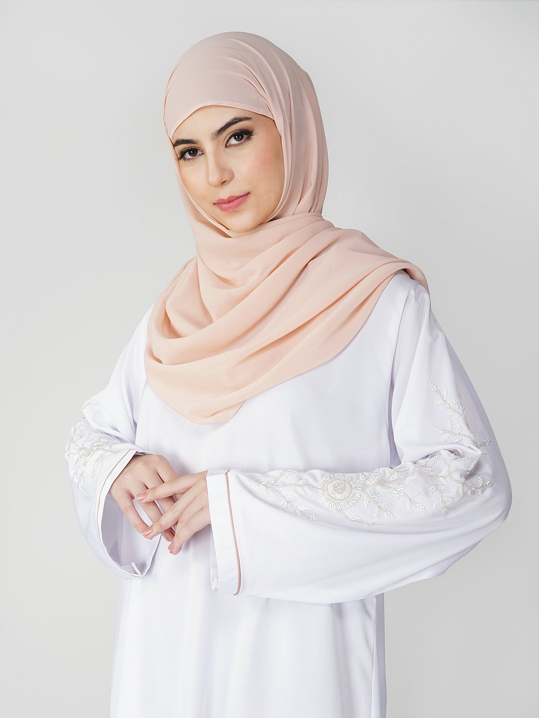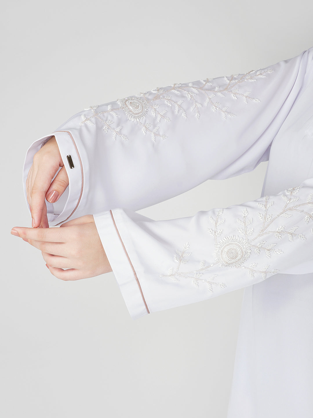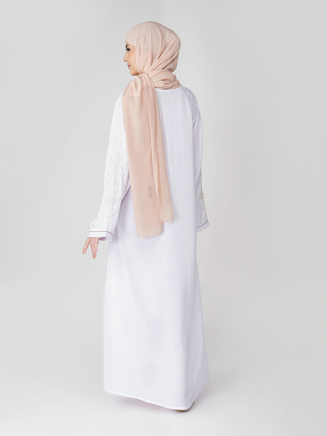 off on prepaidBasic Abaya, Front Closed, Floral Handwork Sleeves, Lightweight and Flowy, Piping at Sleeves Hem, Contrast Dupatta Included