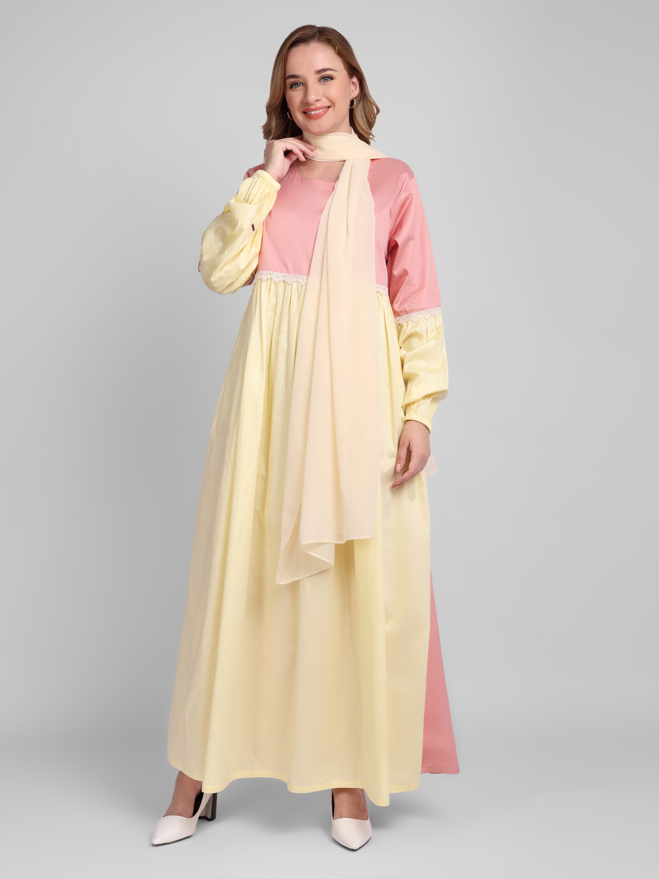 Front Closed, 100% Cotton, Single Elastic Balloon Sleeves, Lace with Gather Detail at Front and Sleeves, Ease opening at the Back, Color-Block Pattern, Lightweight and Breathable, Flowy Look